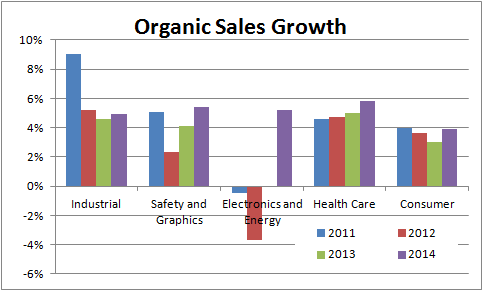 Second, let's look at the trends in organic sales growth within the segments. Despite some patchy performance within its electronics and energy segment, it's clear that 3M has managed to consistently generate underlying sales growth.
