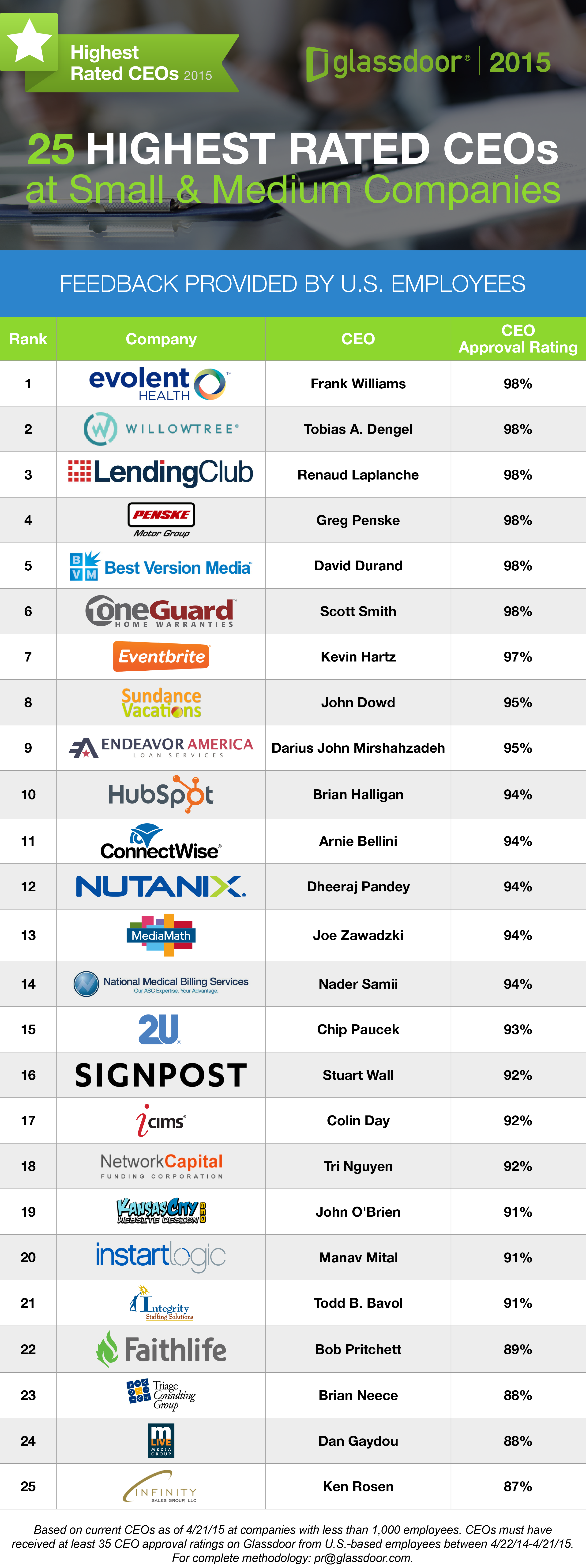 Glassdoor also released a list of the 25 best-rated CEOs of small and midsized companies (those with fewer than 1,000 employees). At No. 1 on that list is Frank Williams of health care consulting and tech company Evolent, which recently went public on June 5th. This is Evolent's first appearance on the list, which only included CEOs with 35 or more employee ratings over the past year.