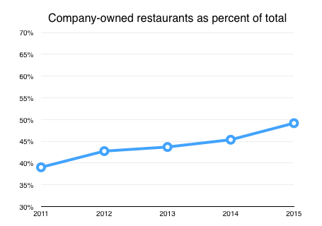 That deal will put the restaurant count at 550 company-managed locations, compared to about 600 franchised stores. In fact, B-Dubs is now close to tipping the scales into over 50% of its restaurant base being company-owned (versus just 39% four years ago).