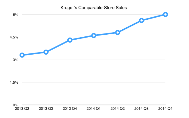 That's why investors should instead focus on comparable-store sales. Kroger has posted accelerating growth in that category for six straight quarters and is likely to notch its 46th consecutive quarter of positive comps.