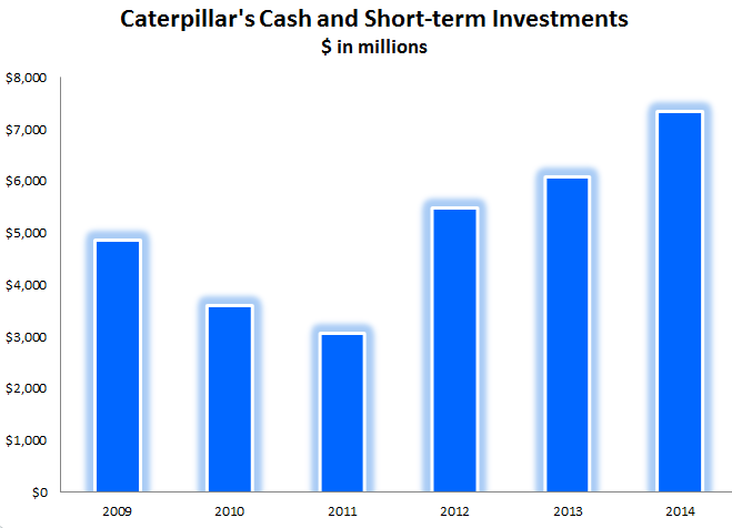 Furthermore, despite weaker revenues and profits, Caterpillar has focused on becoming a more efficient company and has cut costs over the last couple of years. That's helped Caterpillar generate more cash to add to its growing pile of cash and cash equivalents.