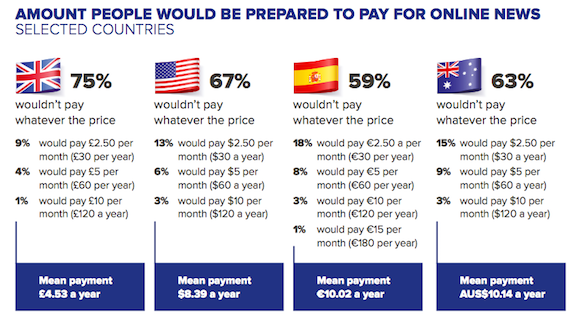 "In most countries the number paying for any news is hovering around 10% of online users and in some cases less than that," the report said. Readers in the U.K. are apparently the worst offenders, with just 6% paying for online news at any point in the past year, compared to (the still paltry) 11% in the U.S.