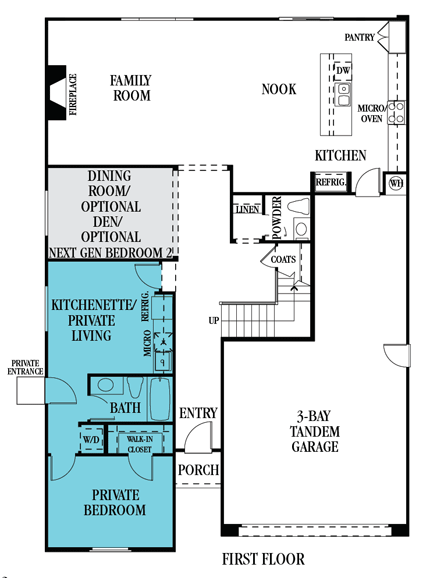 Basically, the Next Gen homes feature a completely separate home (shown in blue in the floor plan below), which consists of a private entrance, kitchenette, living room, bathroom, and bedroom.