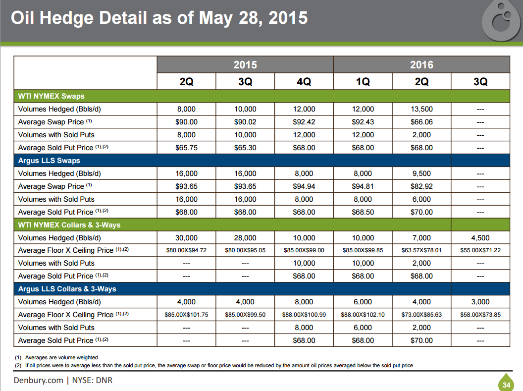 Denbury is somewhere between EOG and Linn Energy. On one hand, it has a very disciplined capital allocation approach to oil production like EOG that has allowed it to remain cash flow positive, like EOG. Conversely, it relies heavily on derivative contracts because its production from using enhanced oil recovery with CO2 is planned out years in advance and allows for some clarity when it comes to budgeting for capital expenditures and paying a decent dividend compared to most upstream oil & gas producers.