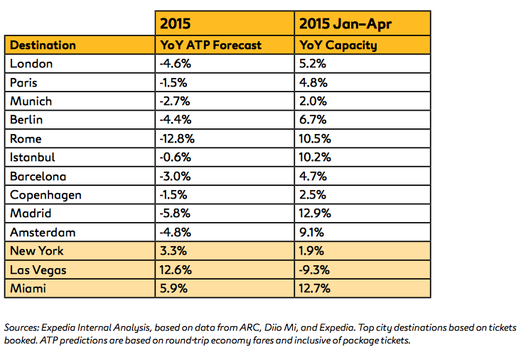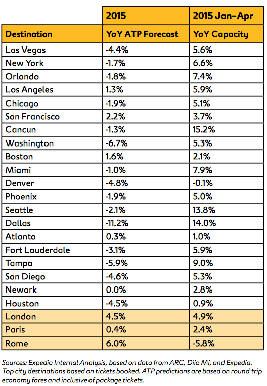 Some of the most popular cities to visit in the U.S. are getting cheaper and the discounts are significant. You can see in the table below from Expedia's (EXPE 0.88%) Preparing for Takeoff: Air Travel Trends 2015 that they're expecting the average ticket prices to Dallas (-11.2%), Tampa Bay (-5.9%), and San Diego (-4.6%) to all be down big in 2015.