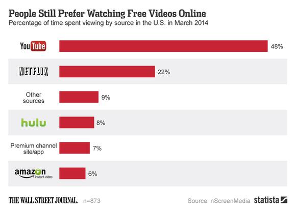 While Netflix (NFLX 1.74%) is often mentioned as the primary beneficiary of this trend, investors may find it interesting to note that it's YouTube that dominates the time people spend watching online video. In fact, according to a March 2014 survey conducted by nScreenMedia, YouTube accounts for 48% of all time people spend watching video online, far ahead of Netflix at 22%.