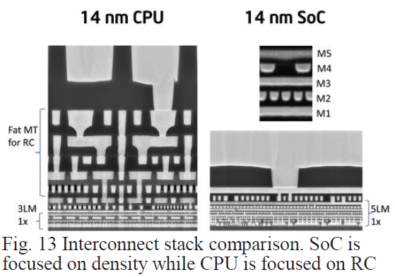 On the left in the image above is a CPU interconnect stack, while a system-on-chip interconnect stack is on the right. The CPU interconnect stack has fewer of the finer pitch metal layers (which enable better density) and several very thick layers. In contrast, the system-on-chip interconnect has many of the very fine pitch metal layers to enable significantly better density.