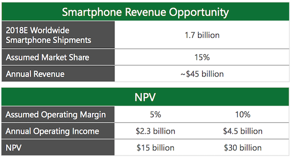 That aforementioned forecast that Microsoft is referring to is the completely unrealistic "strategic rationale" that Microsoft put together when it initially announced the blockbuster deal, assuming that it could ship more than 250 million units in 2018 with an operating margin of 5% to 10%. Keep in mind that, in the last quarter before the deal closed, Nokia's handset business reported a negative operating margin of 17%.