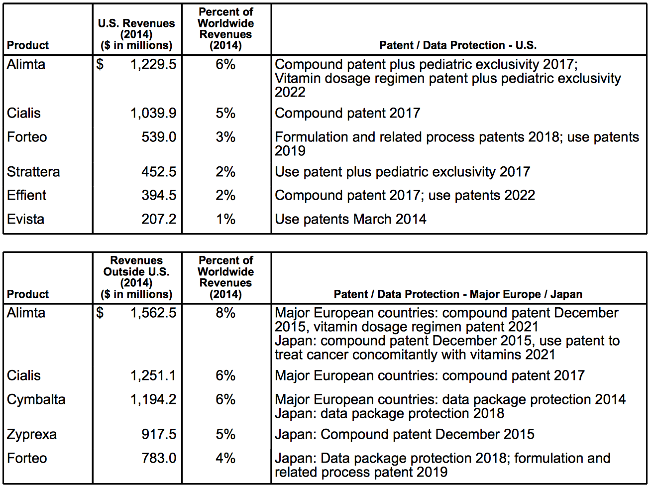 If that proves to be true, it could be real trouble for the company down the road, as those two drugs produced more than 21% of Lilly's 2014 revenue.
