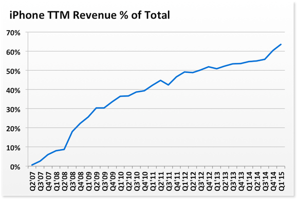 This single product line officially crossed the $100-billion threshold last September in terms of trailing 12-month revenue. The iPhone 6 and 6 Plus launched with just days left in the fiscal year, and the pair subsequently helped iPhone TTM revenue jump to nearly $135 billion in the two quarters since.