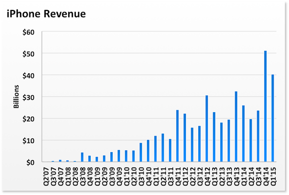 In the first full quarter of availability, the iPhone generated $489 million in revenue. Last quarter, the iPhone generated $40.3 billion in sales.