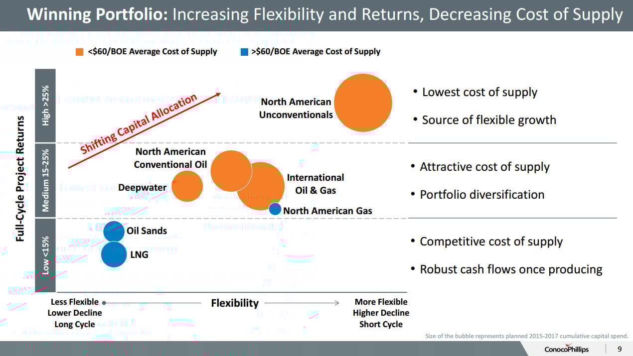 As that slide notes, the biggest shift is coming in capital spending, as ConocoPhillips is cutting spending from $16 billion per year to just $11.5 billion with flexibility to cut it further if necessary. This spending cut will result in slower growth, as its production growth rate will slip from a projected 3%-5% annually to 2%-3%. That said, it's a shift that's really being made possible by its ability to invest in the shorter cash cycle growth found in shale plays.