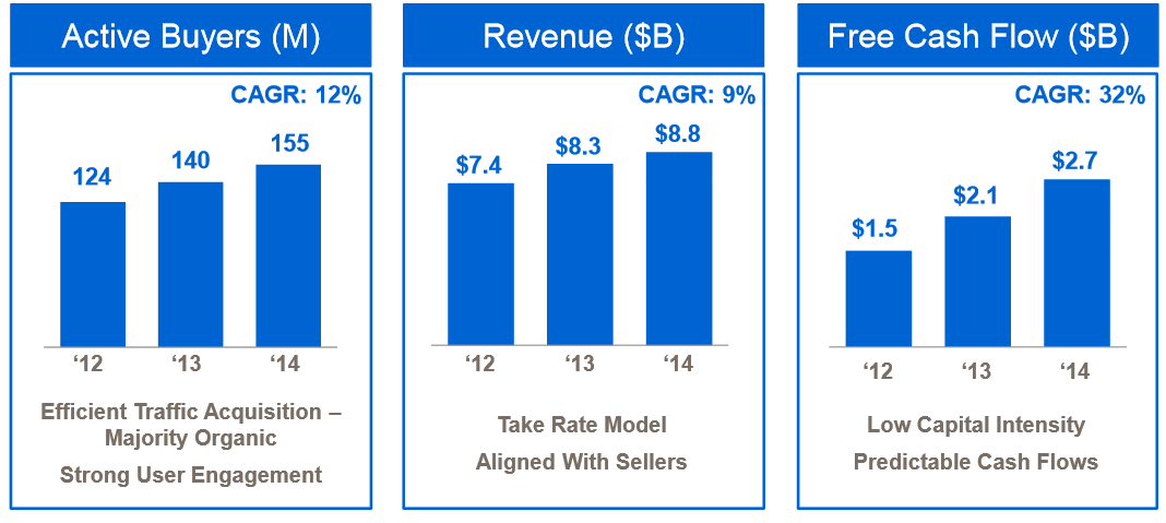 As of the most recent quarter, eBay had 157 million active buyers, a number that's grown at a 12% annualized rate over the past three years. Revenue has grown by $1.4 billion from 2012 to 2014, and the company's free cash flow has increased at an impressive 32% annual rate.
