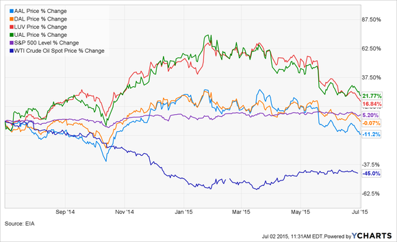 After tumbling in the first part of October due to vastly exaggerated fears concerning Ebola, the shares have trended in opposition to the price of oil, which fell dramatically at the end of last year and into 2015, a decline that has since partially retraced (the bottom blue line in the above chart represents the price of West Texas Intermediate crude oil). Jet fuel is the largest single cost for airlines.
