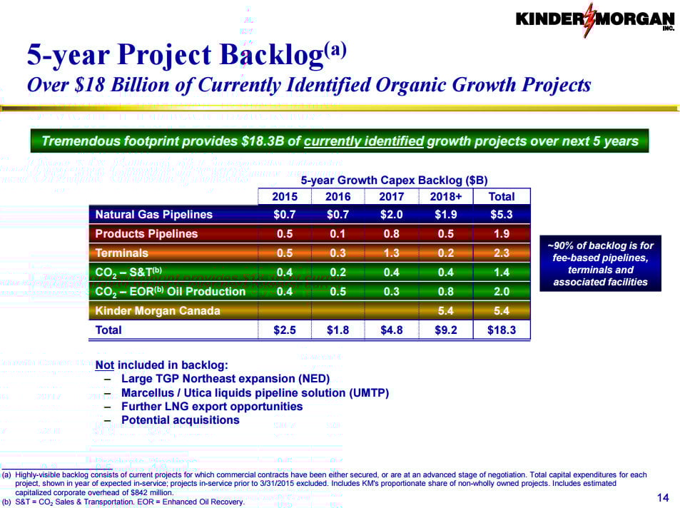 The final number of vital importance to Kinder Morgan investors is its project backlog. Currently, the company expects to invest $18.3 billion in projects over the next five years, as seen on the slide below.
