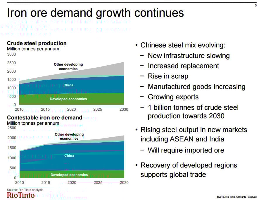 China is also expected to drive growing demand for steelmaking commodities like iron ore and metallurgical coal. The Chief Executive of Rio Tinto's Diamonds & Minerals division, Alan Davies, recently pointed this out in a speech when he noted that, "When it comes to crude steel, China need only grow its production by 1% a year to be at 1 billion tonnes by 2030." That suggests it will need a growing supply of iron ore and metallurgical coal to continue to produce steel, which is exactly what we see in projected iron ore demand in the following slide.
