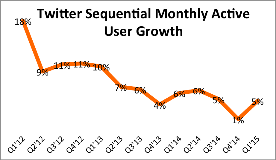 As far back as Twitter's data on monthly active users goes, year-over-year growth rates in the company's user base have been trending downward.