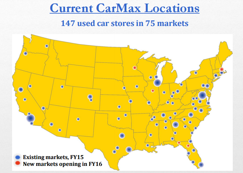 Growing its store count is exactly what CarMax plans to do to help generate more company revenue and profits. As of the fiscal first quarter 2015, CarMax's stores only reached about 63% of the U.S. population. Also, in the markets in which CarMax is present, the company has a roughly 5% market share of used vehicles sold aged zero to 10 years, and a total market share of less than 3% nationwide.
