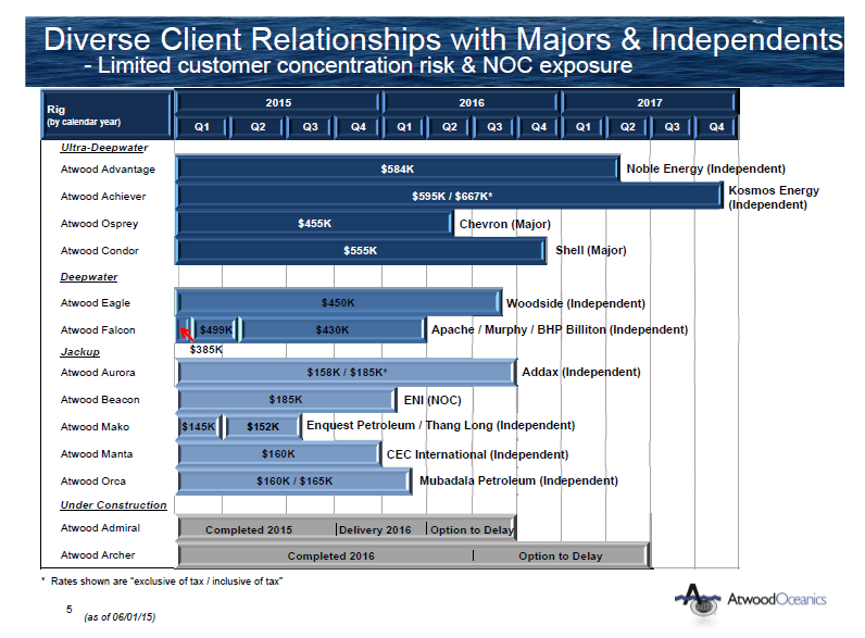 Atwood Oceanics (ATW +0.00%): The Houston-based rig contractor is comparatively smaller than its counterparts. However, its rig fleet is among the most modern with four ultradeepwater, or UDW, rigs out of a total fleet of 11. For the uninitiated, UDW rigs are capable of drilling in water depths between 7,500 feet and 12,000 feet. Additionally, two more UDW drillships are under construction. Average fleet age (excluding rigs under construction) is nine years, which is pretty attractive. Only two rigs are over 12 years old.