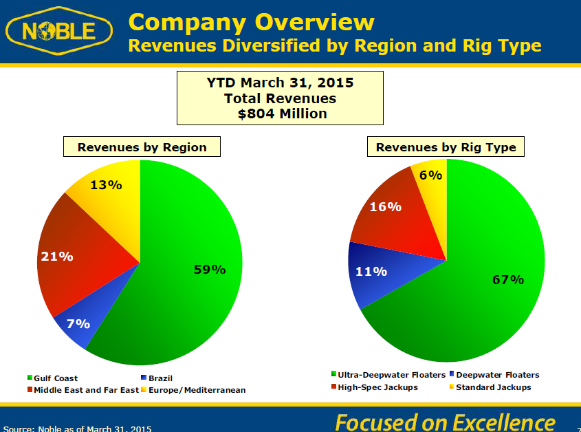 Noble Corporation plc (NE +0.00%): London-based Noble is one of the bigger offshore drilling contractors operating 32 rigs. There are two reasons why this company has made it to the list of the best deep-sea-drilling stocks: First, the company owns 13 ultradeepwater rigs, of which eight are five years old or less. A whopping 67% of the company's revenues are derived from its UDW fleet (see chart below). Average fleet age is a healthy 15.5 years.