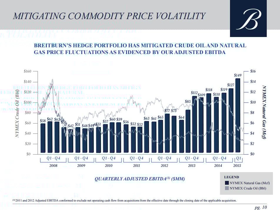 What's noteworthy about that chart is when oil prices plunged by more than 50% in 2008, Breitburn's cash flow only went down 24% from peak to trough. Meanwhile, the more recent plunge in oil prices has yet to impact the company's cash flow as its oil hedges, combined with an acquisition, actually pushed cash flow higher in the first quarter.