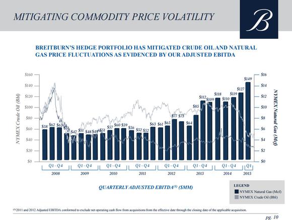 Breitburn Energy Partners L.P. (BBEP +0.00%) uses oil and gas hedges to protect it from commodity price volatility. These hedges have historically enabled the company to mitigate commodity price volatility for several quarters, giving it time to make adjustments. But that time has proven to be a two-edged sword as it has also given the company the confidence to be more aggressive on borrowing money to fund growth. It's a decision that backfired as Breitburn's debt load has been a nearly unbearable weight on the company's unit price, which is down more than 80% over the past year.