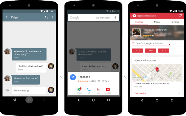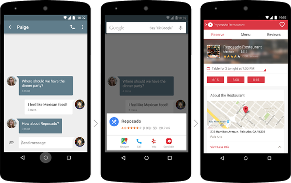 Google Now on Tap will integrate with other aspects of the phone, including email and messaging. Google Now will be able to search a message for points of interest, then offer up information relevant to the discussion (reviews of a restaurant, information on a movie, prompts to set a reminder for an upcoming event).