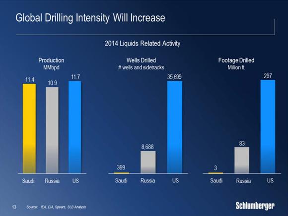 A lot of reasons have been given as to why Saudi Arabia is allowing the oil price to not only fall but remain weak. Some suggest it's because it's seeking to harm emerging rivals like the U.S. and Russia. Others have suggested that the move is because it wants to keep its regional rival Iran at bay. While both could be true, the reason Saudi Arabia isn't worried about the oil price is because it doesn't need a high oil price to justify the drilling costs needed to maintain or grow its production. This is due to the fact Saudi Arabia only needed to drill 399 new wells last year just to keep its daily production at 11.4 million barrels of oil. That's a simply jaw-dropping number when we compare it to its two closest rivals, which are detailed on the following slide from a Schlumberger Limited (SLB 2.43%) investor presentation.