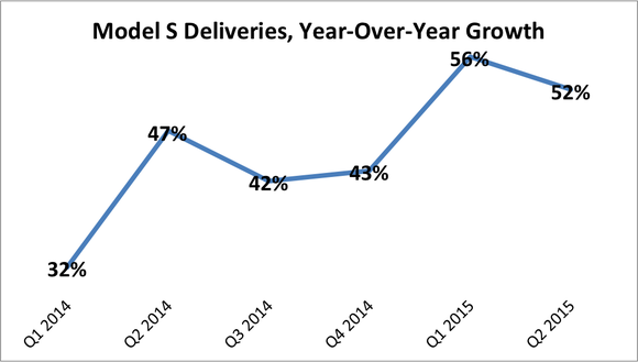 With two quarters for 2015 already passed, Tesla is on track with its plan to increase Model S sales this year by 50%. Model S deliveries were up 56% from the year-ago quarter in Q1 and 52% in Q2.