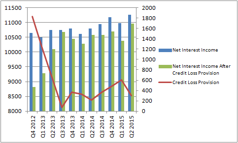 As you can see in the chart below, credit loss provisions fell sequentially, but they increased on a year-over-year basis from $217 million in last year's second quarter to $300 million in the second quarter of 2015. This suggests that the bank's interest income isn't being artificially boosted by the bank being generous with its credit loss provisions.