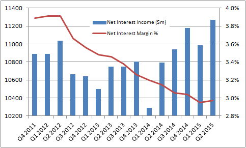 In a nutshell, the trend in Wells Fargo's earnings has been for declining net interest margins. NIM simply means the difference between the interest its investments generate and its interest expenses divided by its average earning assets. A high NIM is better for Wells Fargo.