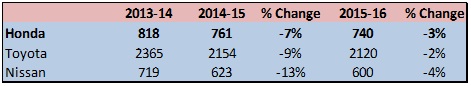 Honda has projected a 3% sales slide in Japan in the 2016 fiscal year. That would improve on the 7% fall in the last fiscal year. Honda is not the only victim, as the Japanese auto industry as a whole is anticipated to fall by 5.4% in the fiscal year. A sales tax hike in April 2014 and the negative environment created by continuous car recalls have affected all three key players in the market.