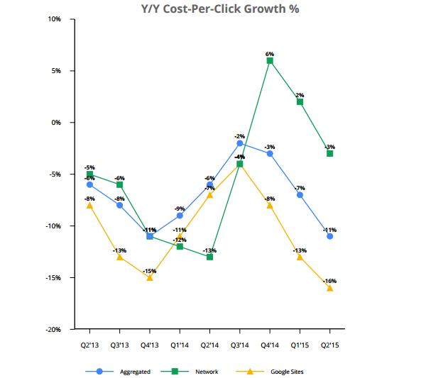 For perspective on the recent downward trend in costs-per-click, here's the latest chart from Google dating back to the beginning of 2013: