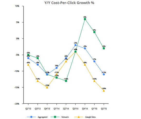 Google's ad business also included 13% growth in revenue from its own sites, to $12.4 billion, and more modest 2% growth from Google Network Members' websites, to $3.6 billion. Aggregate paid clicks rose 18% year over year, helped by 30% growth in paid clicks on Google websites, and held back by a 9% decline in paid clicks on Google Network Members' sites. Aggregate cost-per-click fell 11%, including a 16% decline on Google sites, and a 3% drop from Google Network Members' sites.