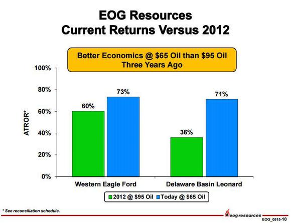 When oil prices plunged late last year, EOG Resources pulled back the reins on its peer-leading oil growth engine. In fact, after growing oil production by double digits for the past few years, the company's production is expected to be flat in 2015, as the company turned its attention to pushing its costs as low as possible to improve its returns. The result is better returns at a $65 oil price than the company was earning when oil was $95 per barrel a few years ago: