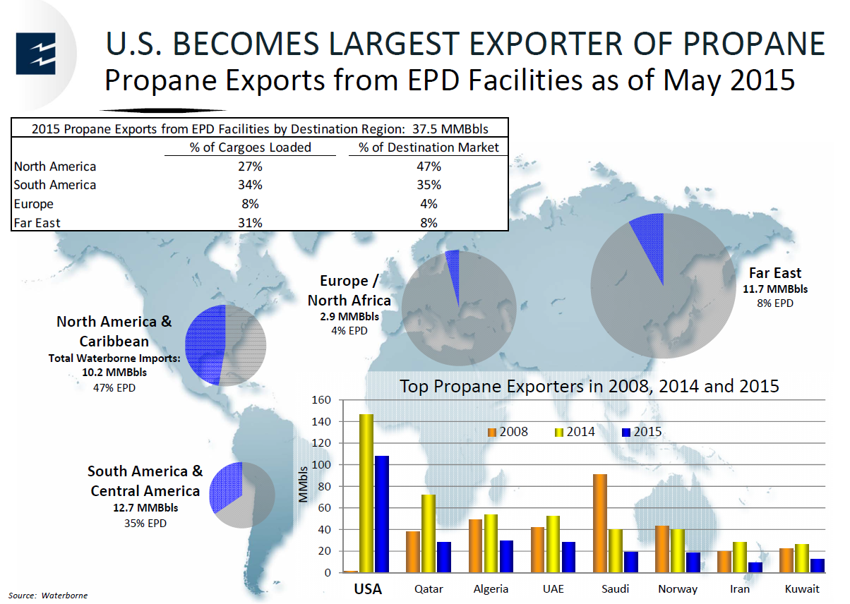 Enterprise already had a massive distribution network of natural gas liquids pipelines and processing facilities across the nation, and now it has leveraged that existing infrastructure to become one of the world's most prominent exporters of natural gas liquids. So far in 2015, it has exported more propane than every other OPEC nation: