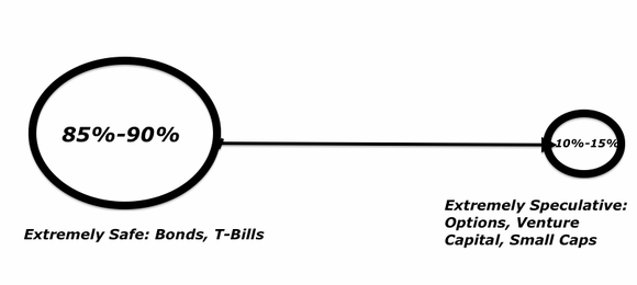 To have a barbell approach, Taleb suggests that investors put 85% to 90% of their assets in extremely safe investments -- like short-term bonds -- and the other 10% to 15% in highly aggressive, speculative plays.