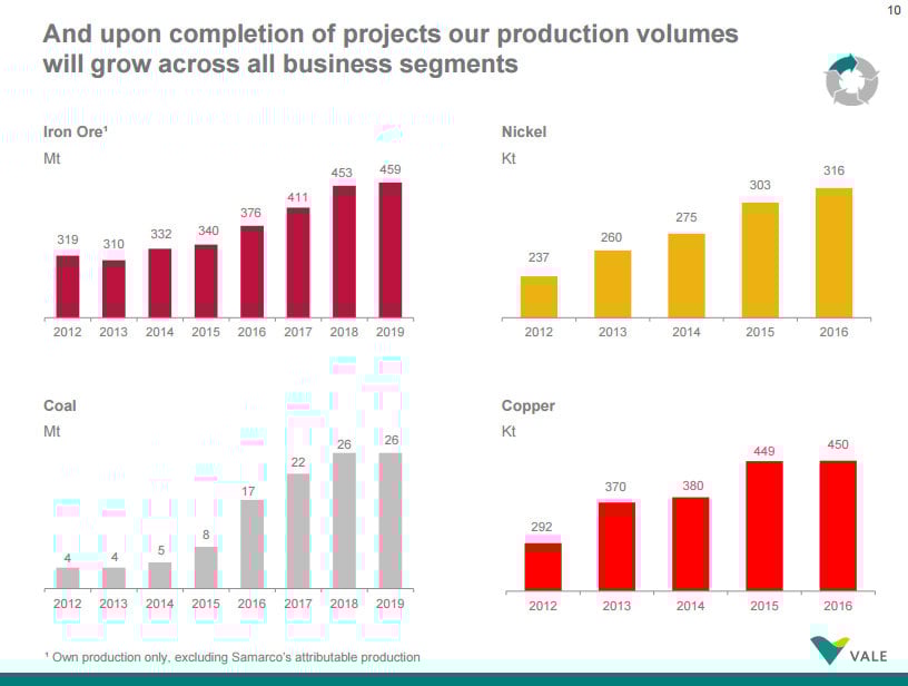 Like Rio Tinto, Vale produces many of the key natural resources needed for global industrialization. The company is actually in the process of expanding its production capacity across all four of its business segments so that it can capture a greater portion of future natural resource demand, as we can see on the slide below.