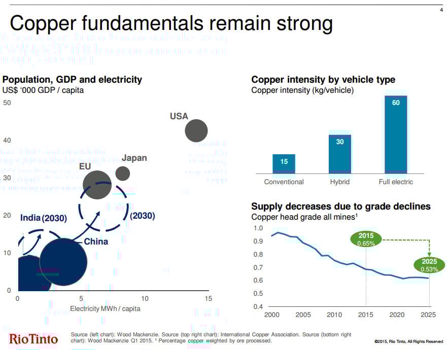 The first chart I want to draw your attention to is the one on the left. It's pointing out that as both China and India industrialize through 2030, each nation's per capita electricity needs will grow, which will lead to increased demand for copper from both countries. Meanwhile, as the slide in the right-hand corner suggests, copper intensity per vehicle grows as nations further industrialize from conventional gasoline-powered cars to all-electric vehicles. These trends bode well for copper producers like Rio Tinto, making it a great stock to watch as the globe continues to industrialize.
