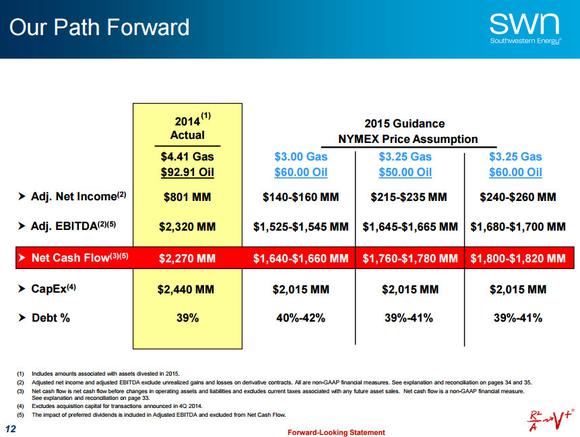 As that slide makes clear, the company's high case for its cash flow in 2015 is banking on $3.25 per thousand cubic feet of gas--mcf--and $60 per barrel of oil to deliver $1.8 billion in cash flow. However, at the moment gas is closer to $2.75 per mcf while oil is heading toward $50 a barrel, suggesting that like Chesapeake Energy its cash outspend will be very wide in 2015.