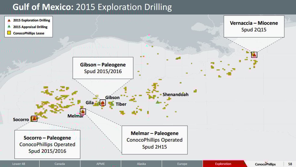 ConocoPhillips' most recent retrenching is hitting its deepwater exploration program. While the company didn't put a dollar figure on the cut, it did say it intends to reduce future deepwater spending, while virtually pulling the plug on its operated Gulf of Mexico program, which is highlighted on the slide below.