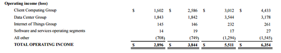 Let's turn our attention back to the 70% number given for the second quarter. Intel reported total operating income for the quarter of $2.896 billion. The breakdown of that operating income by segment can be seen in the following table: