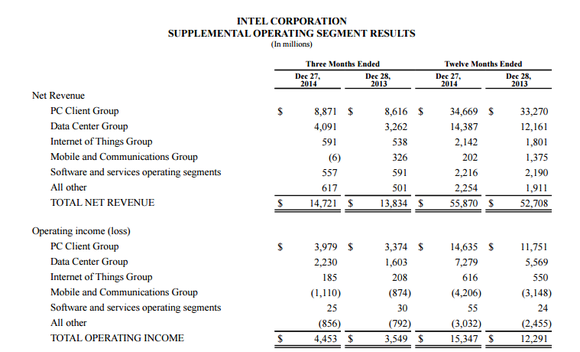 To understand the "trick" that Intel is performing, I would like to direct your attention to the table below from Intel's fourth quarter 2014 earnings release: