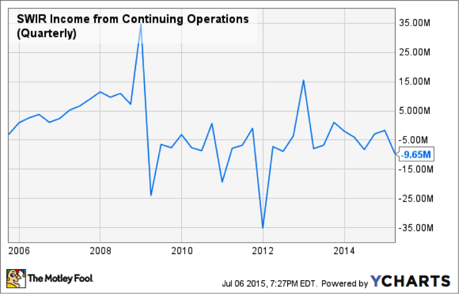 In terms of Asset Plays, the 2014 annual report divulges $11,000 (not million) in Canadian tax-loss carryforwards, $9,000 in U.S. tax-loss carryforwards, and $6,000 in California R&D tax credits. These tax-loss carryforwards are losses from prior years that companies keep on the books to reduce tax obligations in the future. But the annual report also reveals losses from continuing operations in each of the last three calendar years, and in 2014, year-over-year revenue declines in the Americas (down 1%) and EAFE (down 22%). The most recent quarterly financials show a $10 million loss from continuing operations.