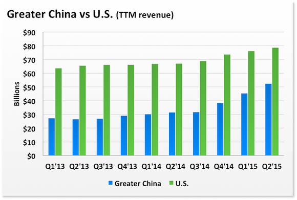 These days, Apple has generated $52.5 billion in TTM revenue in Greater China, as it closes the gap with the $78.8 billion in TTM revenue that the company has generated in the U.S.
