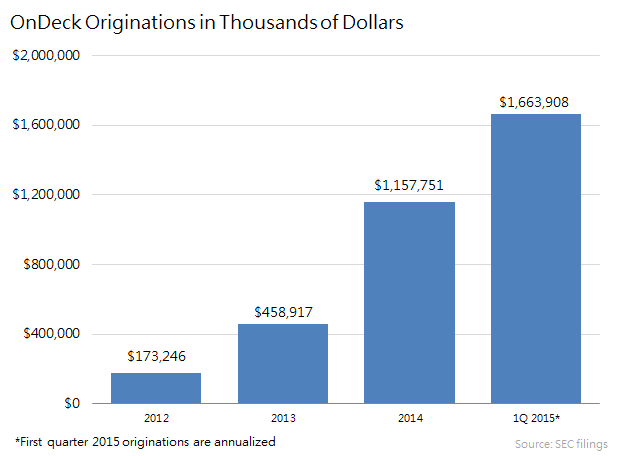 OnDeck now believes its target market to be businesses in need of $250,000 or less. Based on data from the FDIC, lenders currently originate about $180 billion of these loans each quarter, and OnDeck believes there could be $80 to $120 billion of additional demand still unmet by existing lenders.