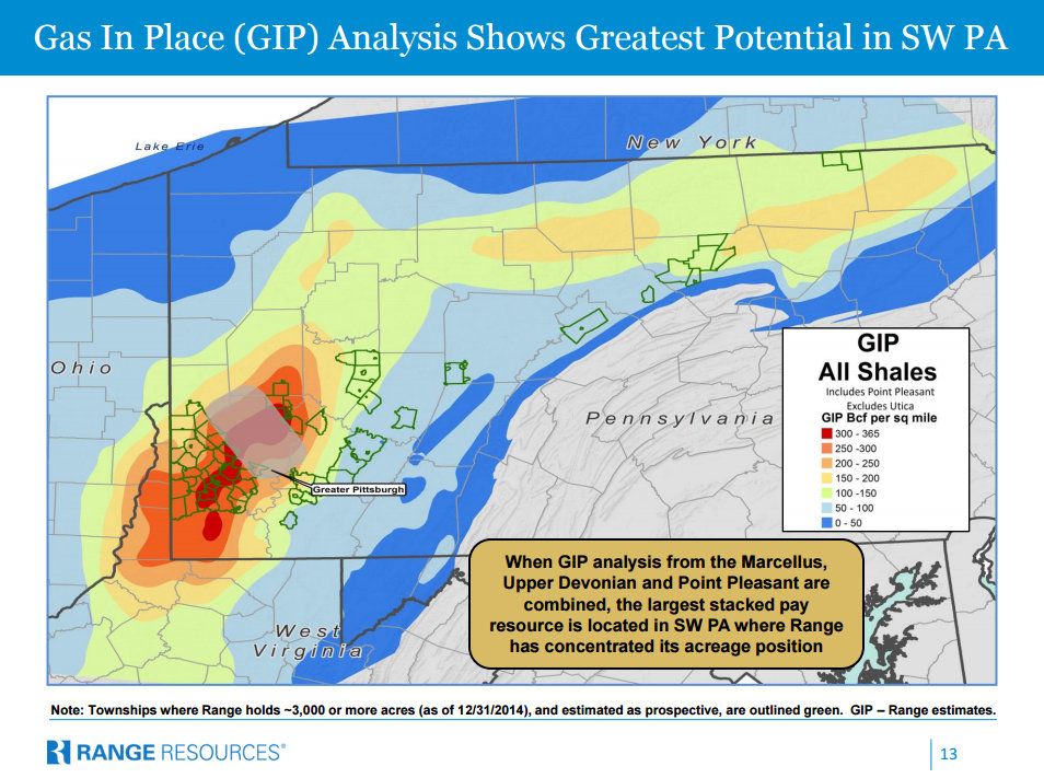 Range Resources' acreage position is also centered on the rocks that contain the most gas in place. As this map shows, the company controls a concentrated acreage position in southwestern Pennsylvania.