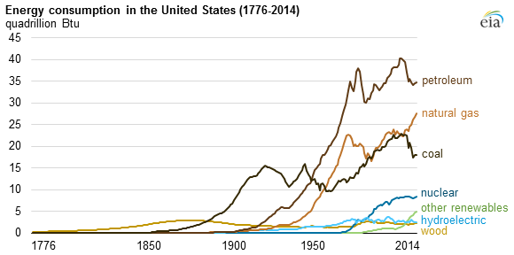 You can see in the chart below that the U.S. was once a country that got nearly all of its energy from wood. The energy source was plentiful and cheap as far as fuels went at the time. But since 1850 wood has almost entirely been replaced by coal, petroleum, natural gas, nuclear, and hydroelectric energy.