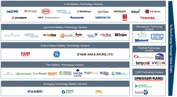 There are also dozens of large companies getting into the energy storage business and lots that make batteries that are very similar to Tesla's. Below is an image from GTM Research that shows some of the major players in the upstream value chain of energy storage. You can see that Tesla Motors isn't alone.