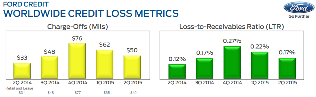 Ford Credit's managed receivables checked in at $118 billion, a $7 billion increase from a year ago and $4 billion higher than at the end of last year. Another favorable tidbit of information from Ford Credit was the loss-to-receivables ratio, which was 0.17%, the low end of its historical level.